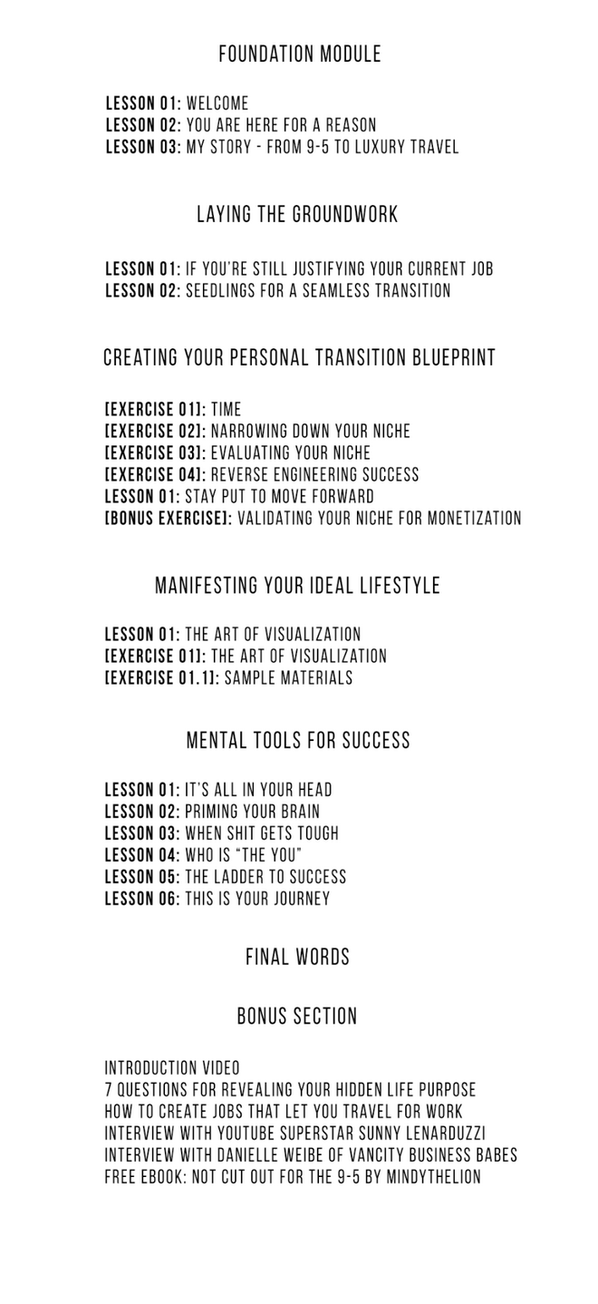 Some people in the past have taken a bold leap by quitting their jobs to pursue a life of freedom, only to find themselves floundering around in the abyss of life. Some people struggle, go broke, lose friends, and live out the nightmare narrative of anyone who has ever thought about quitting a stable job to do something else, and in the pursuit of freedom, somehow ended up with even less freedom than before.I've been there - and it's rough times.But that's what happens when you make the rookie mistake of jumping into the deep end before you know how to swim.I would have done anything for a 'how-to' guide or a mentor to help me through that process. Something to help make sense of what this type of transition requires, the steps I needed to take, and the tools I needed to learn, so that I didn't have to make major life decisions all by trial and error. It felt like there wasn't anything out there I could lean on for guidance... which is why I decided to make this course myself.